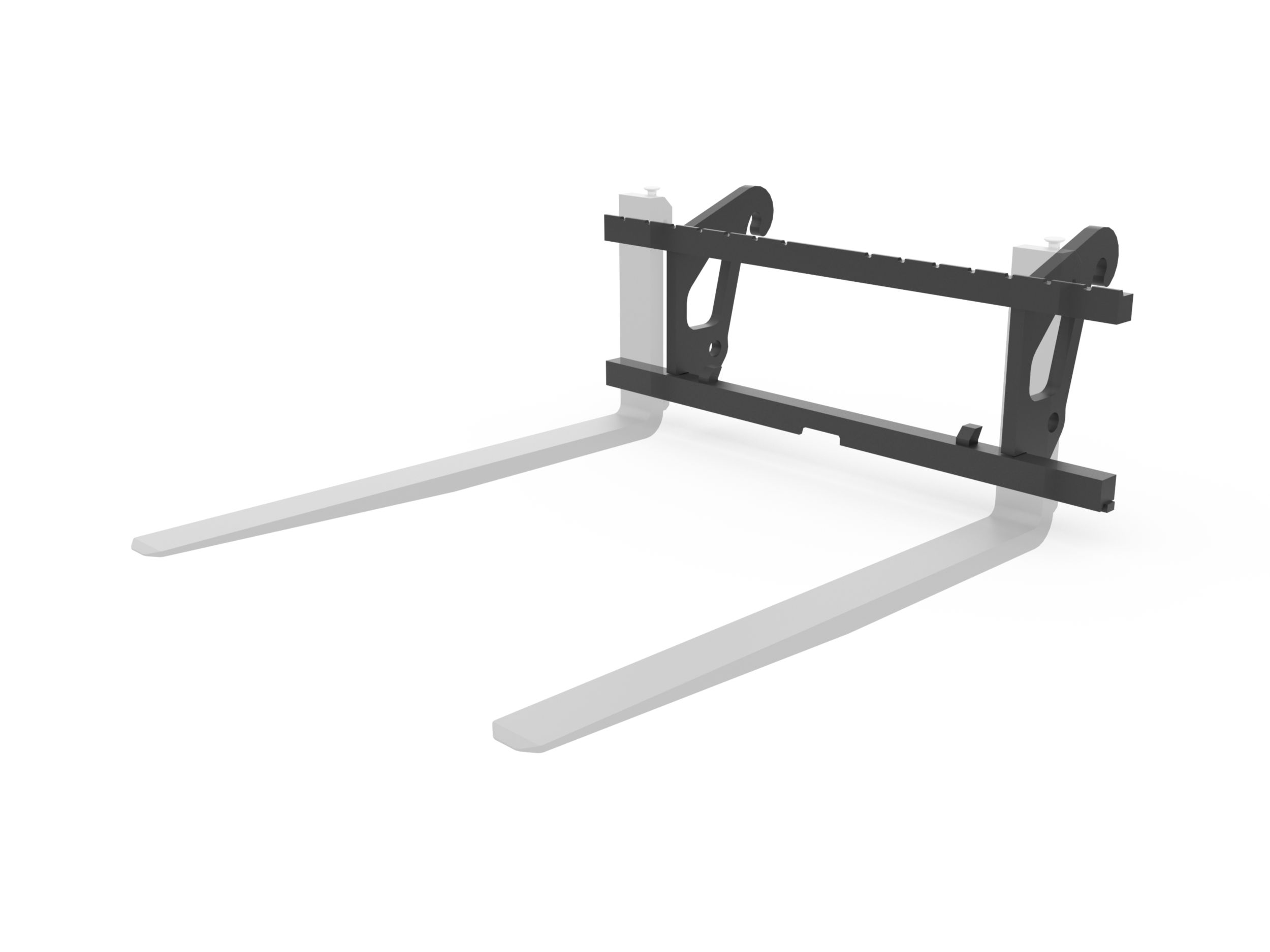 Notched rail-type carriage design allows fork tines to be easily re-spaced or changed and locked into place.