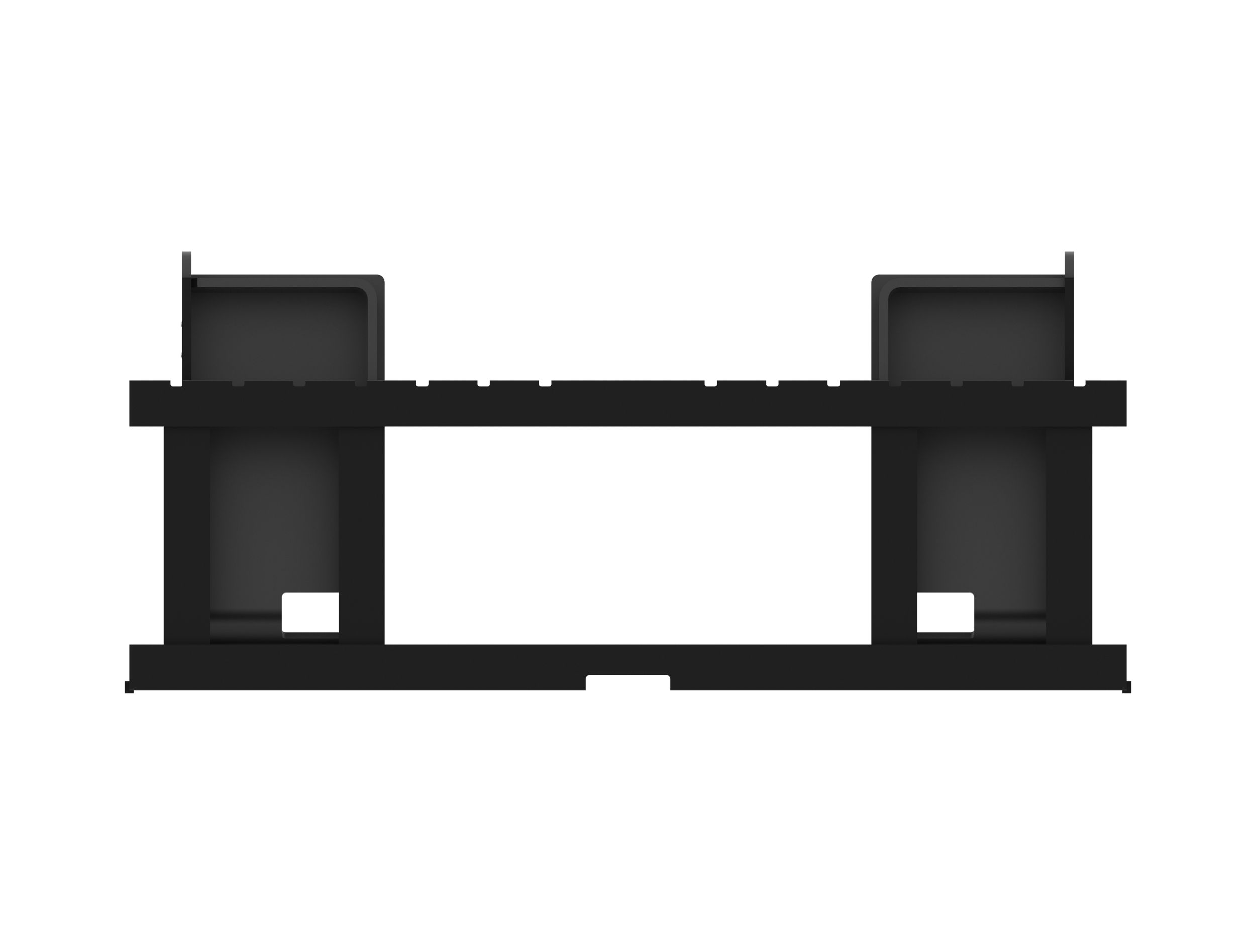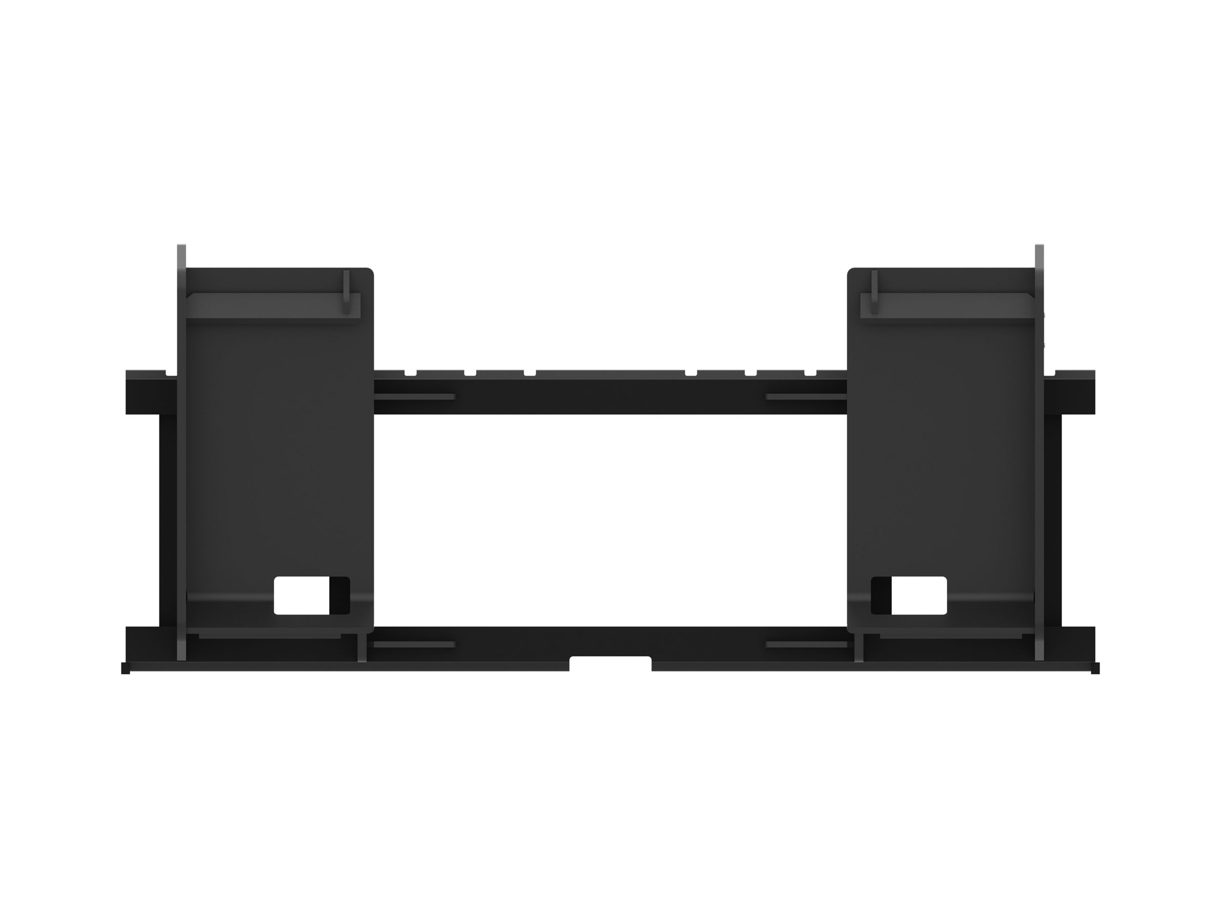 Notched rail-type carriage design allows fork tines to be easily re-spaced or changed and locked into place.
