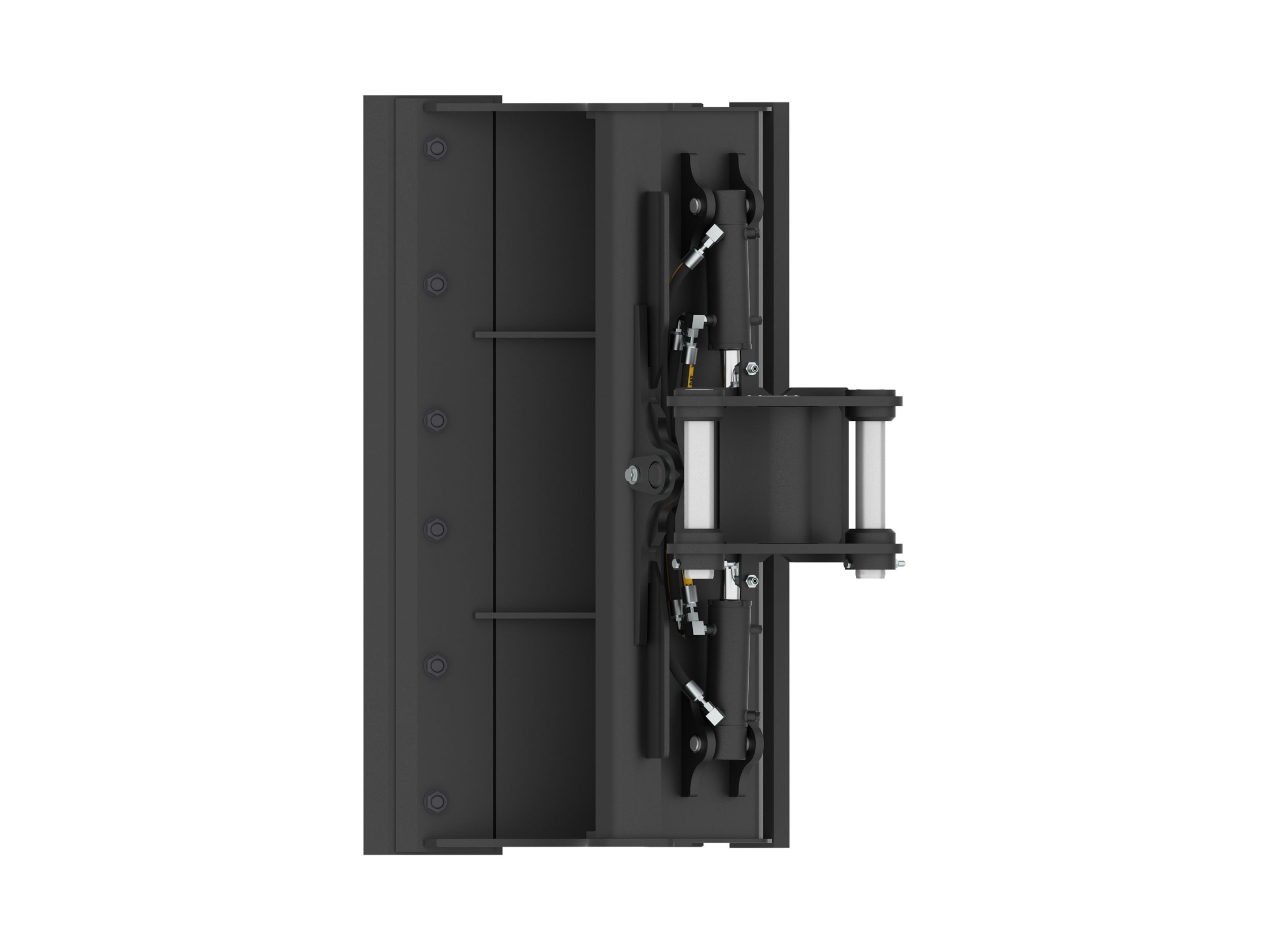 Dual horizontally positioned hydraulic cylinders provide short, smooth cycle times and maximize tilt momentum. The bucket can tilt 45 degrees left or right of center.
