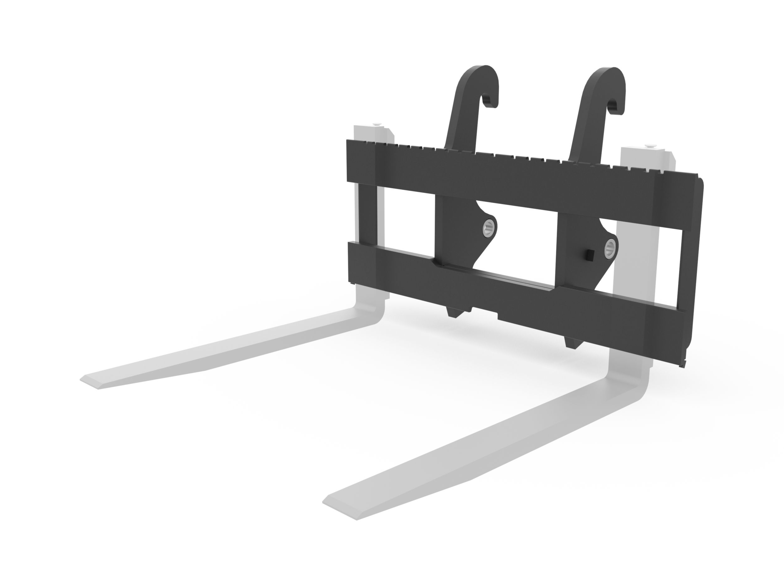 Notched rail-type carriage design allows fork tines to be easily re-spaced or changed and locked into place.