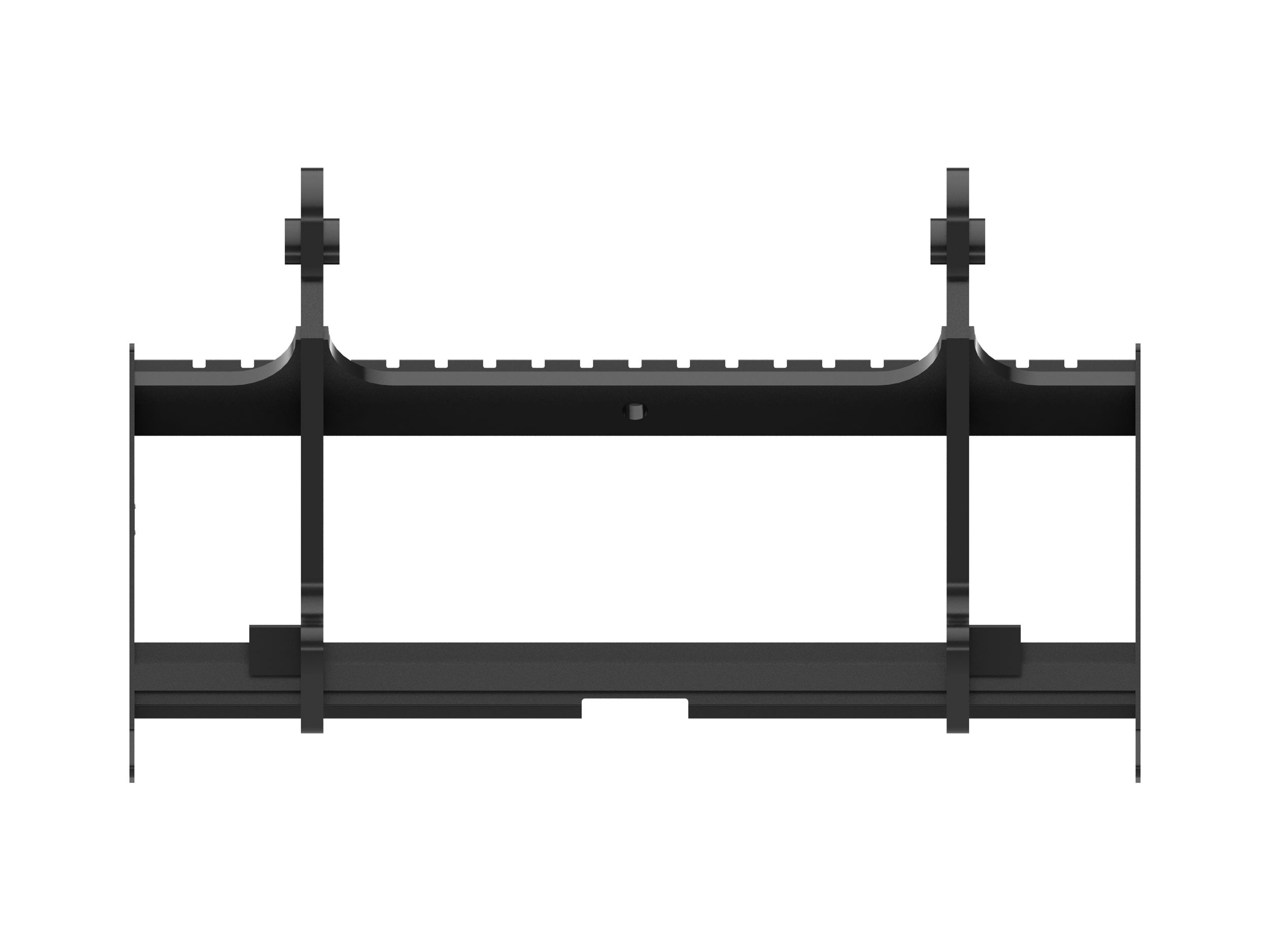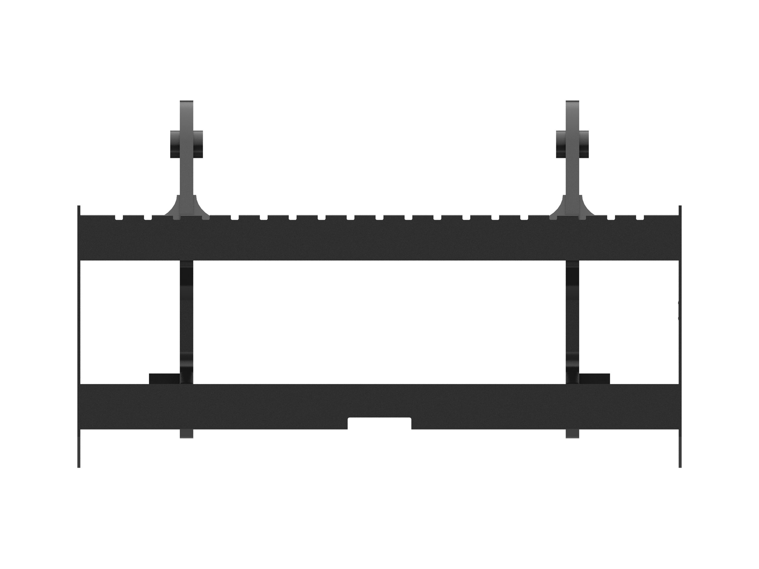 Notched rail-type carriage design allows fork tines to be easily re-spaced or changed and locked into place.