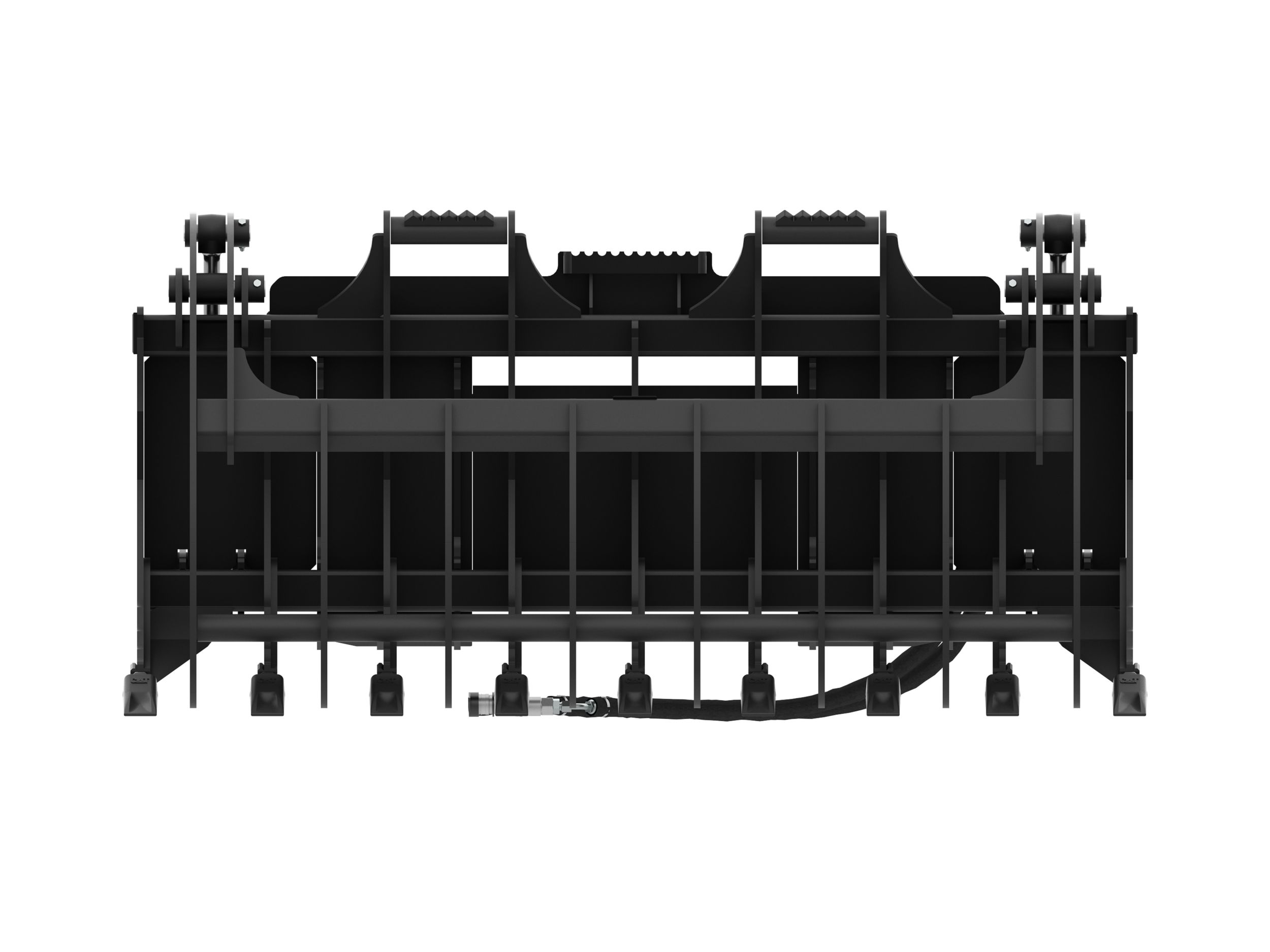 Serrations on the grapple and the tines help to ensure retention of larger objects and debris.