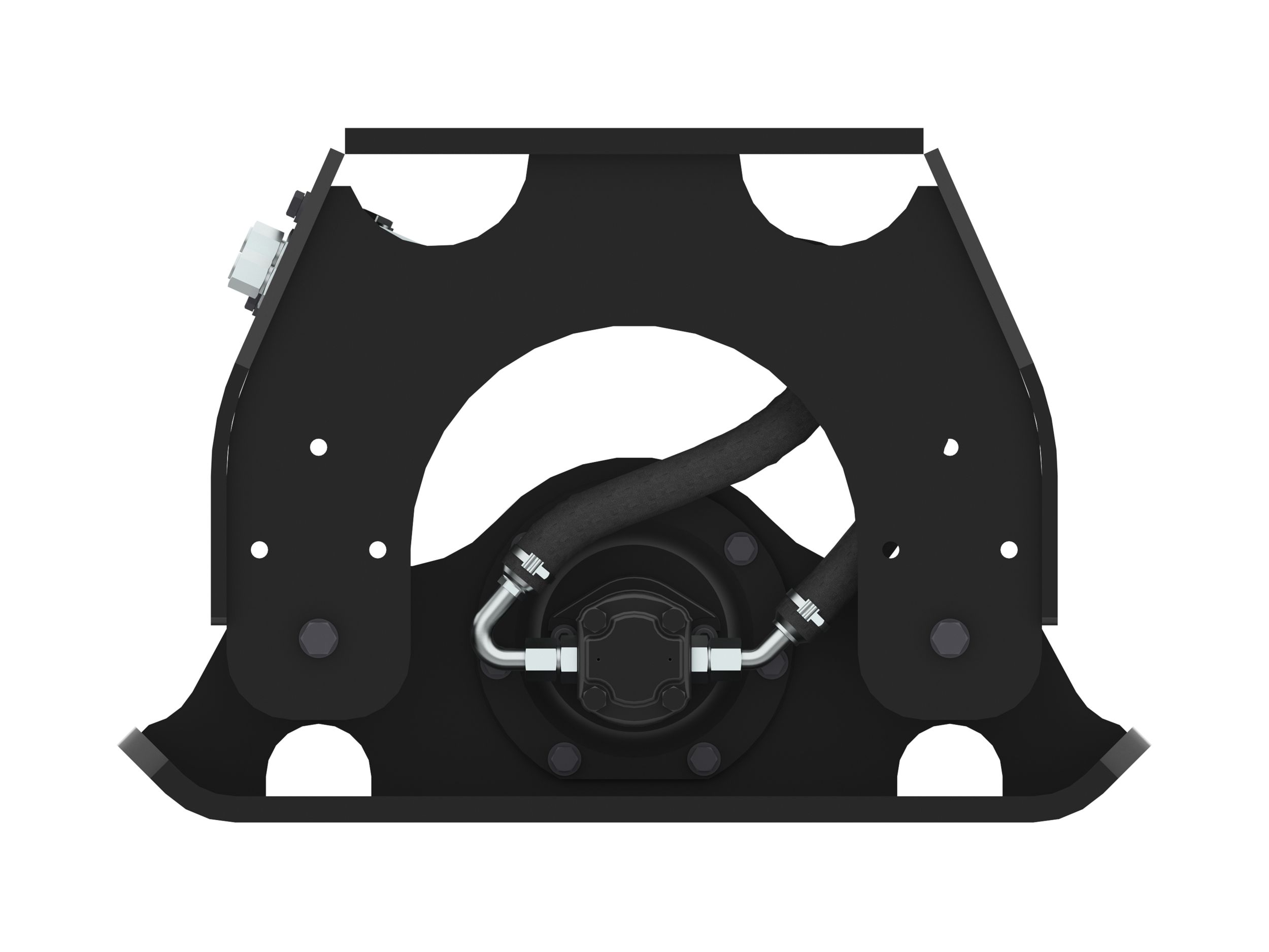 Hydraulic hoses are protected inside the frame of the compactor. Jumper lines are routed out the back of the compactor. Hoses are out of the way