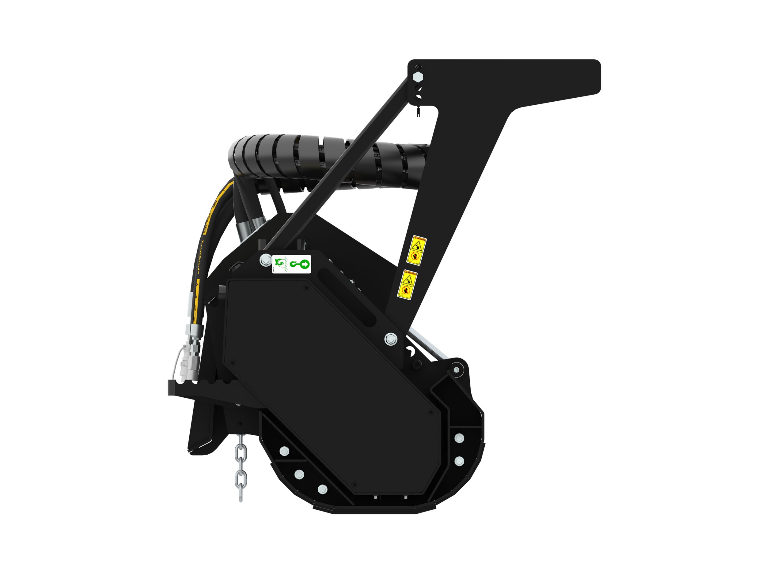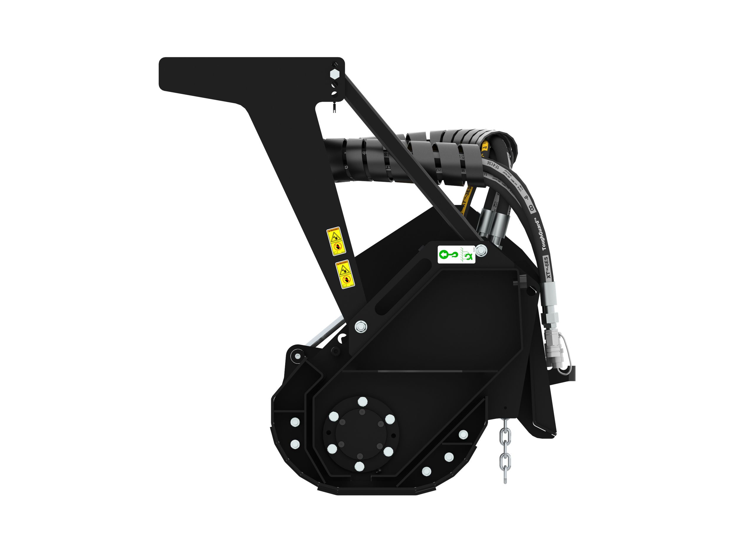 Hydraulically operated front hood is standard. Linkage is enclosed within mulcher frame on High Flow models. Quick to open and close door allows for finer finished material to be produced from cutting all types of vegetation.